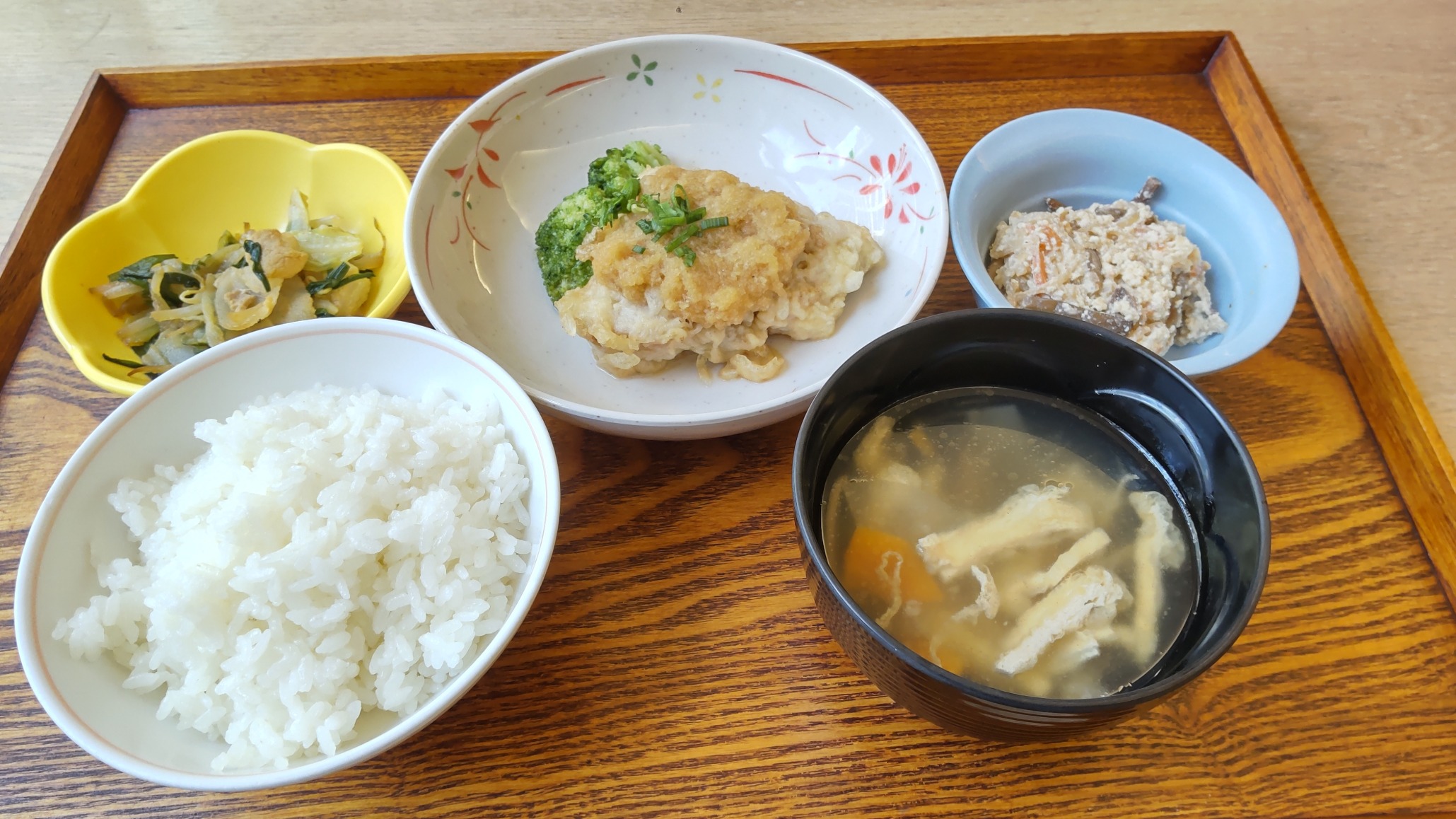 栄養科のスタッフがアレンジでご入居者の皆さんが召し上がりやすいようにおろしポン酢をかけてお肉も衣も柔らかく仕上げました