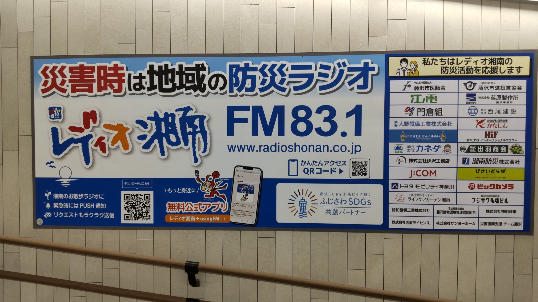 藤沢駅の地下通路にレディオ湘南様の防災・災害のパネルに私たちライフケアガーデン湘南の名前が載りました