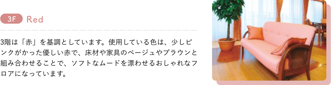 フロアごとに配色を変え、自分の部屋がどこにあるのかわかりやすくし、視力の弱った方にもきれいに見えるコーディネートにしています。壁の絵画とあわせて高齢者にわかりやすく心和める設計になっております。